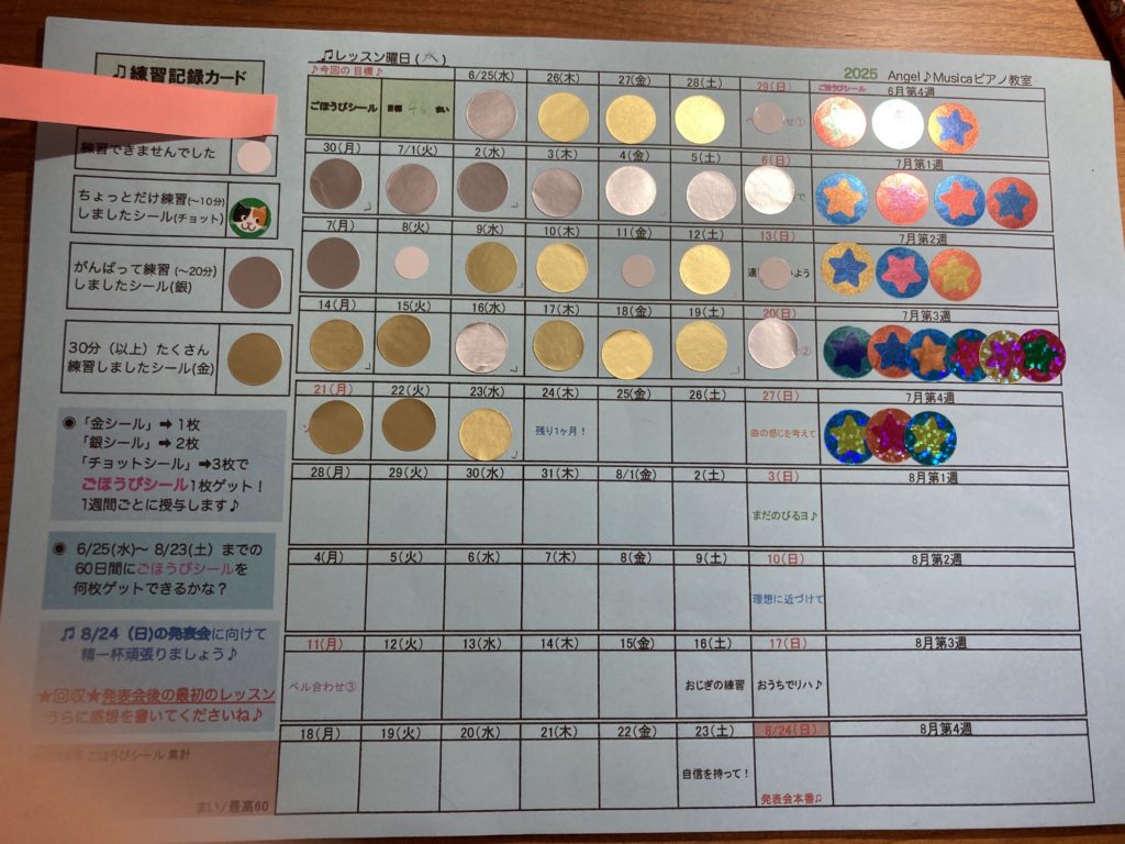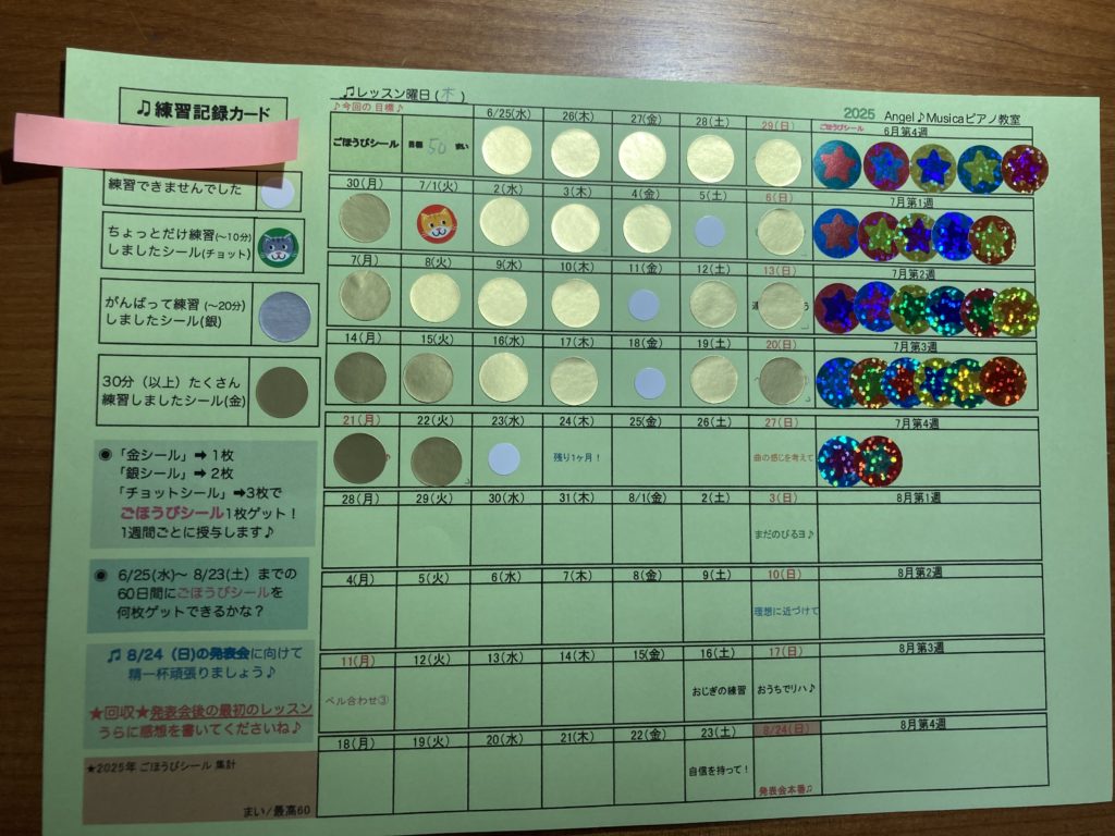 いつも発表会の60日前から『練習記録カード』に記録をつけ始めます。